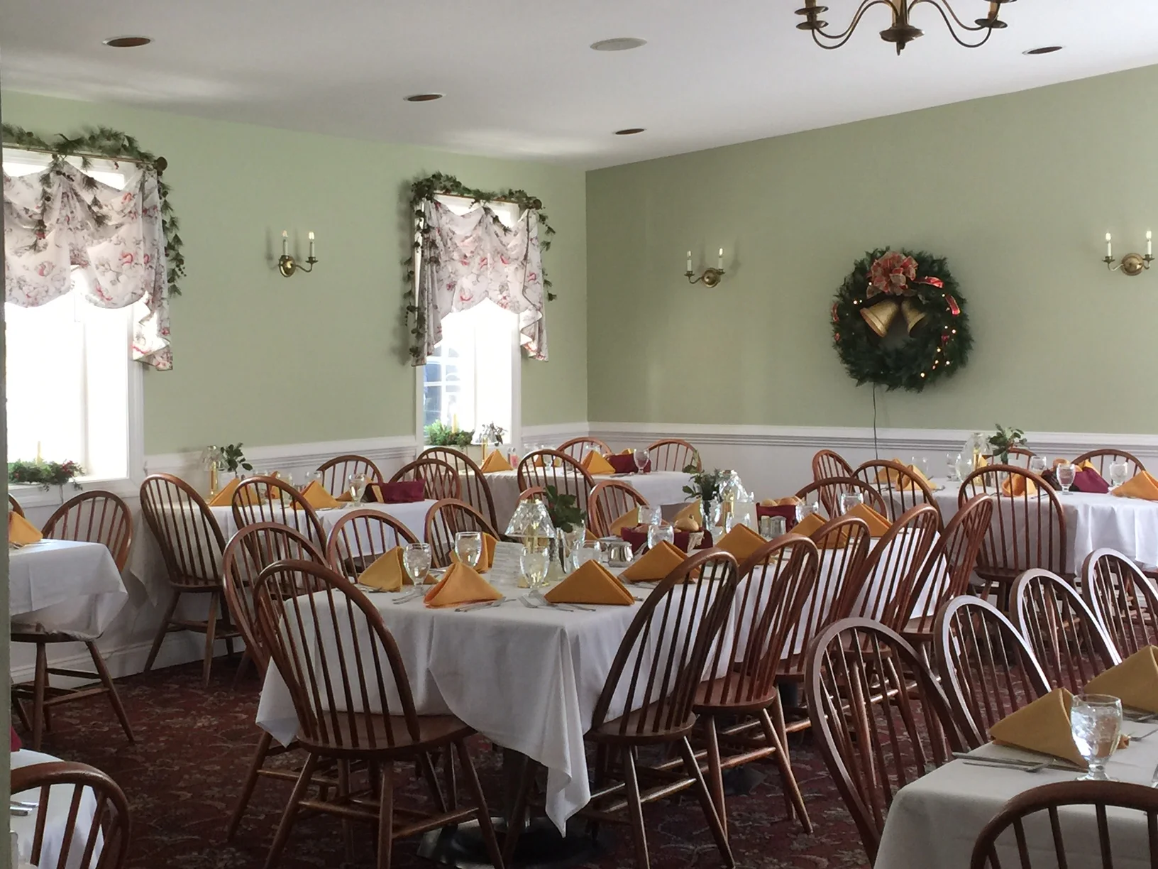 A traditional feel with modern appointments, our spacious, comfortable main dining room boasts a massive, working, stone fireplace. This room is a favorite for both intimate dinners and larger events. Gatherings of two to seventy dine and relax in this grand room with a high ceiling and beautiful chandeliers. An expanse of windows, including porch-side, allow for natural light and ample views of our charming, natural, rustic surroundings. Spring through Fall, our guests enjoy views of our bison grazing in the meadows!
